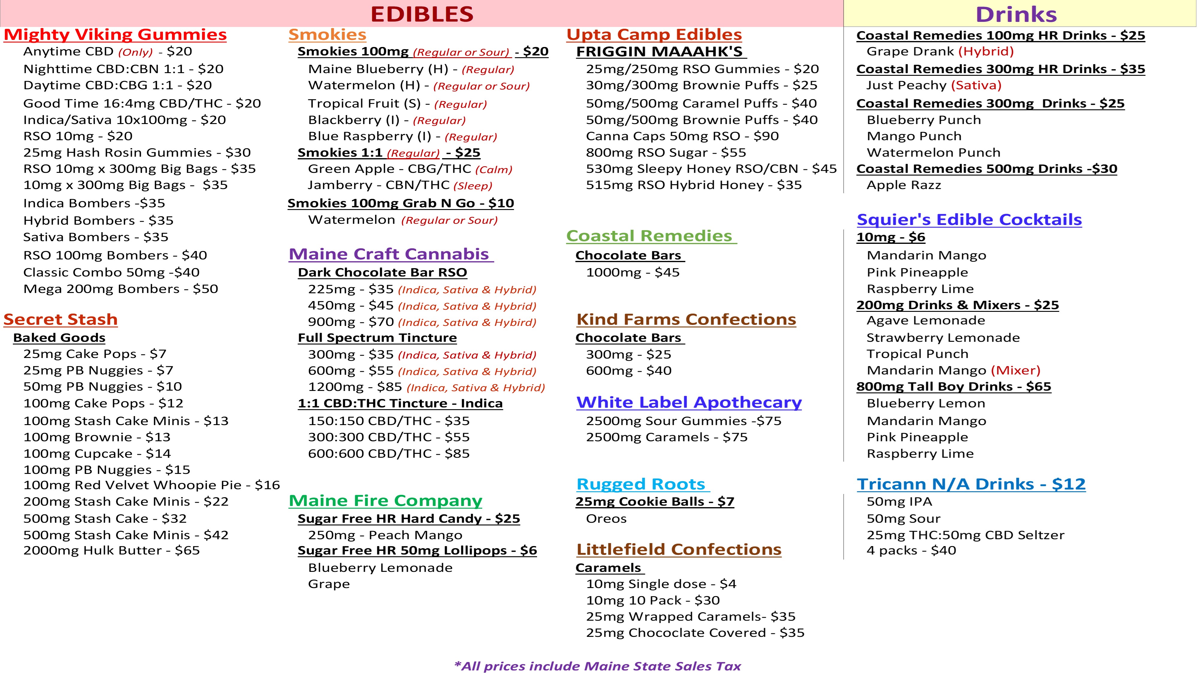 - Secret Stash Edibles- 25mg Peanut butter nuggies, 100mg Cake Pops, 100mg Brownies and Red Velvet Whoopie Pies.